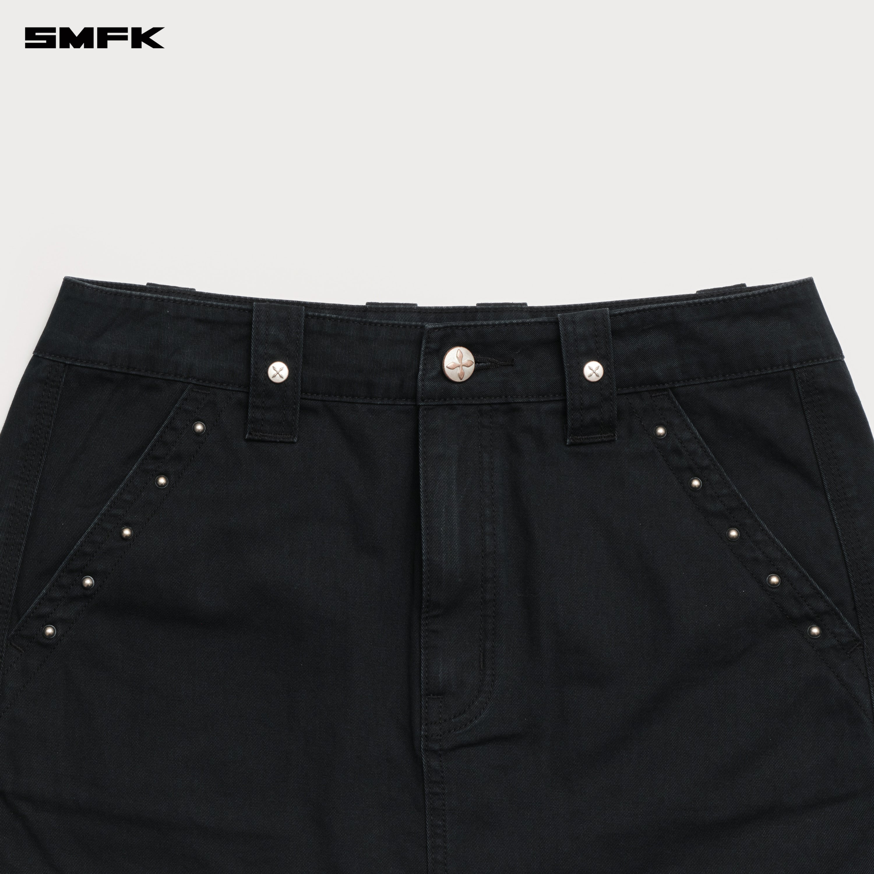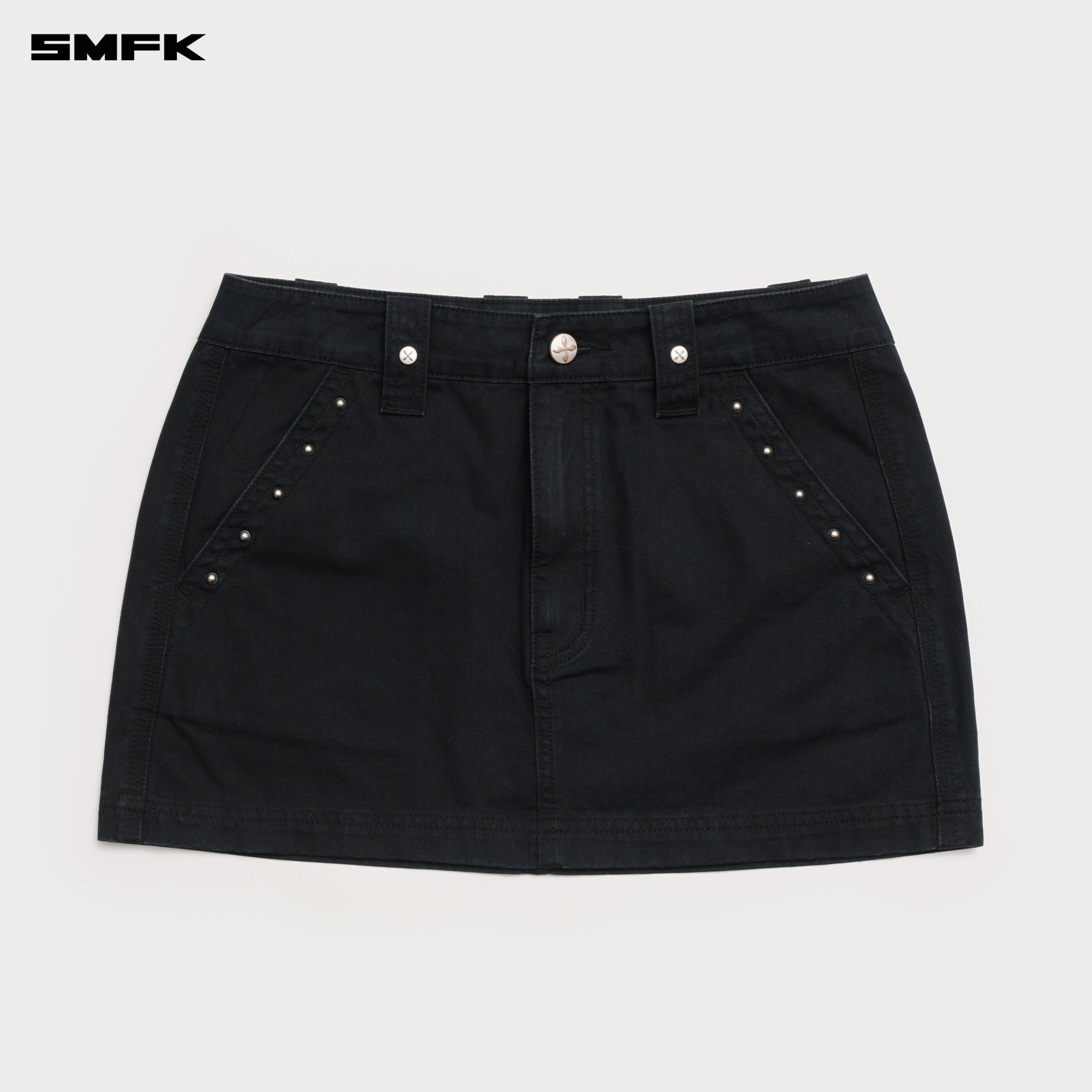 - Design: Cargo skirt designed by SMFK in 2025, medium to high waist. Inspired by lumberjack cargo pants, with the enlarged iconic slanted pockets and oversized beltloop.
