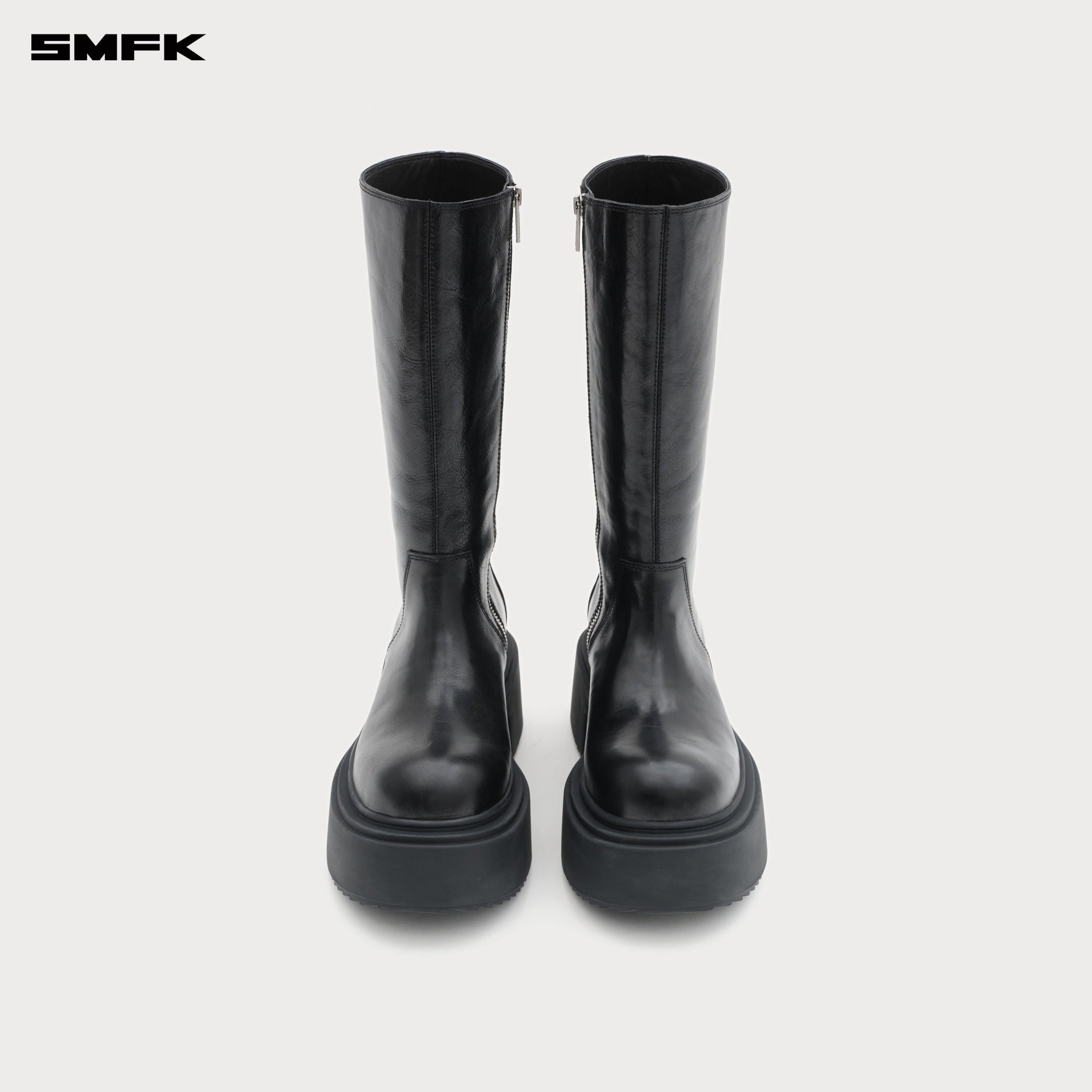 - Design: A simple and integrated high riding boots designed by SMFK in 2023. Inspired by riding boots used in equestrian sports. The sewing of the shoe body and the sole is more solid, suitable for outdoor multi-terrain and urban daily use. The one-piece rubber high-heeled sole (7.5-8 cm) is inspired by the base of an art sculpture. The sole features a wavy hiking shoe pattern (small-scale texture). SMFK's series of shoes are supplied with self-sourced leather materials, providing high-quality materials in a long-term and stable manner: in thickness/texture/density/color, reflecting the rough and wild spirit of SMFK. The outer leather is made of large-textured waxed cowhide developed and produced by SMFK in 2025. It is medium to thick, dyed black, and painted with wax to protect the surface. After rubbing, it forms a flocculent leather texture, and finally the surface is polished to show the luster of the mineral. The rough and wild original leather cutting process reflects the level and quality of the leather. The shoe body will naturally ooze out an oily luster and natural texture after long-term wear and use. Calfskin is used for the inner lining, with a delicate matte waxy texture.