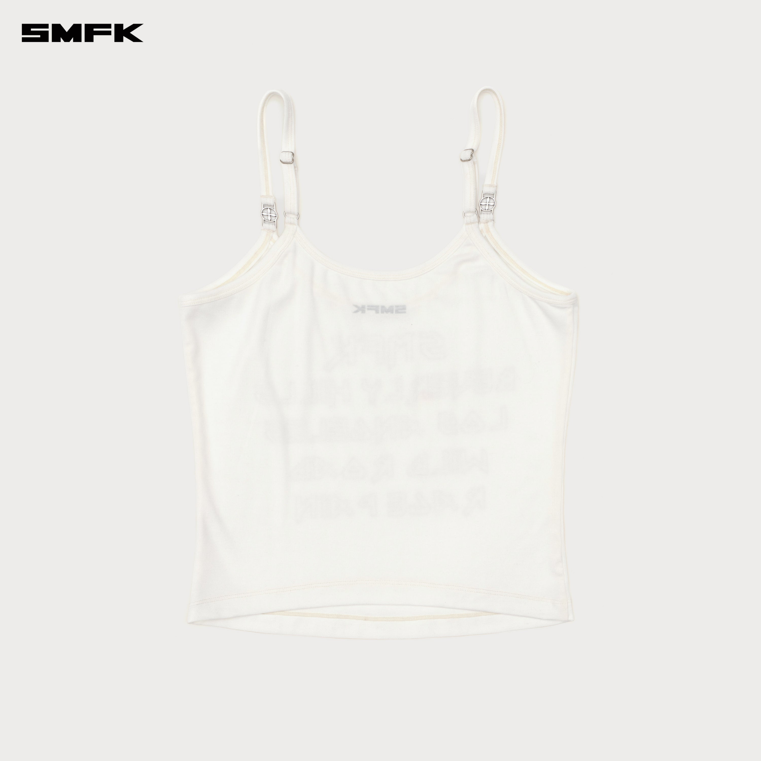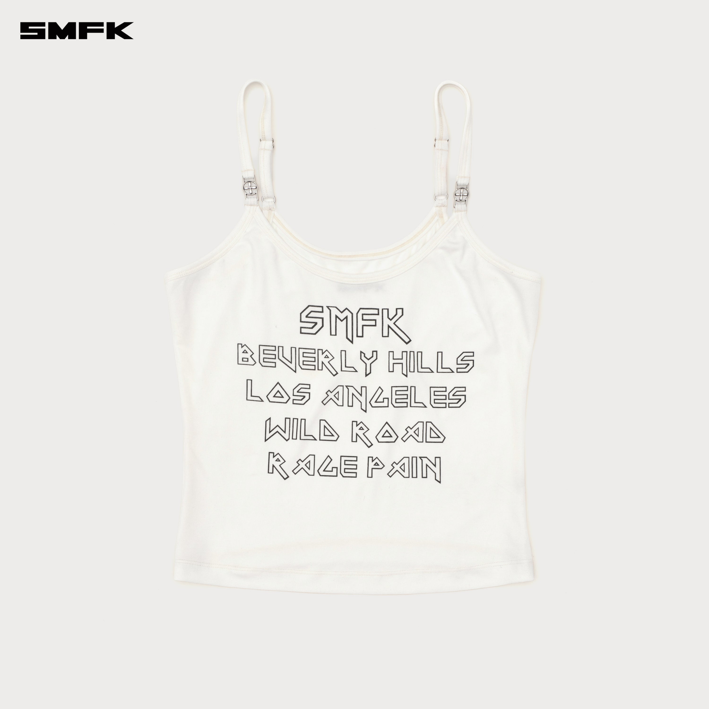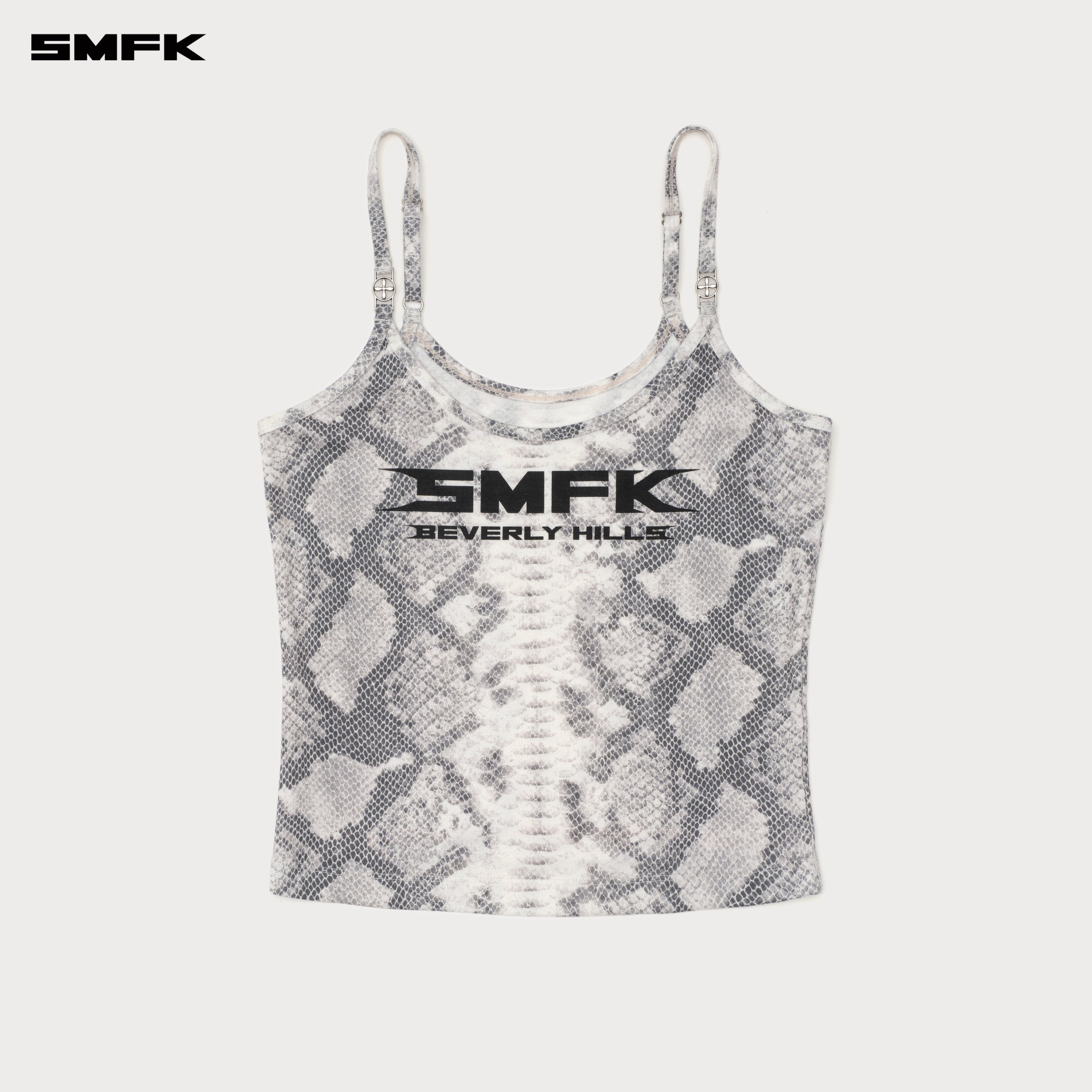 - Design: A sports strap top designed by SMFK in 2023, fitted-waist. Metal circular compass buckle on shoulder strap, adjustable back shoulder strap. "SMFK Beverly Hills boutique" in metal rock fonts printed on the front and back.