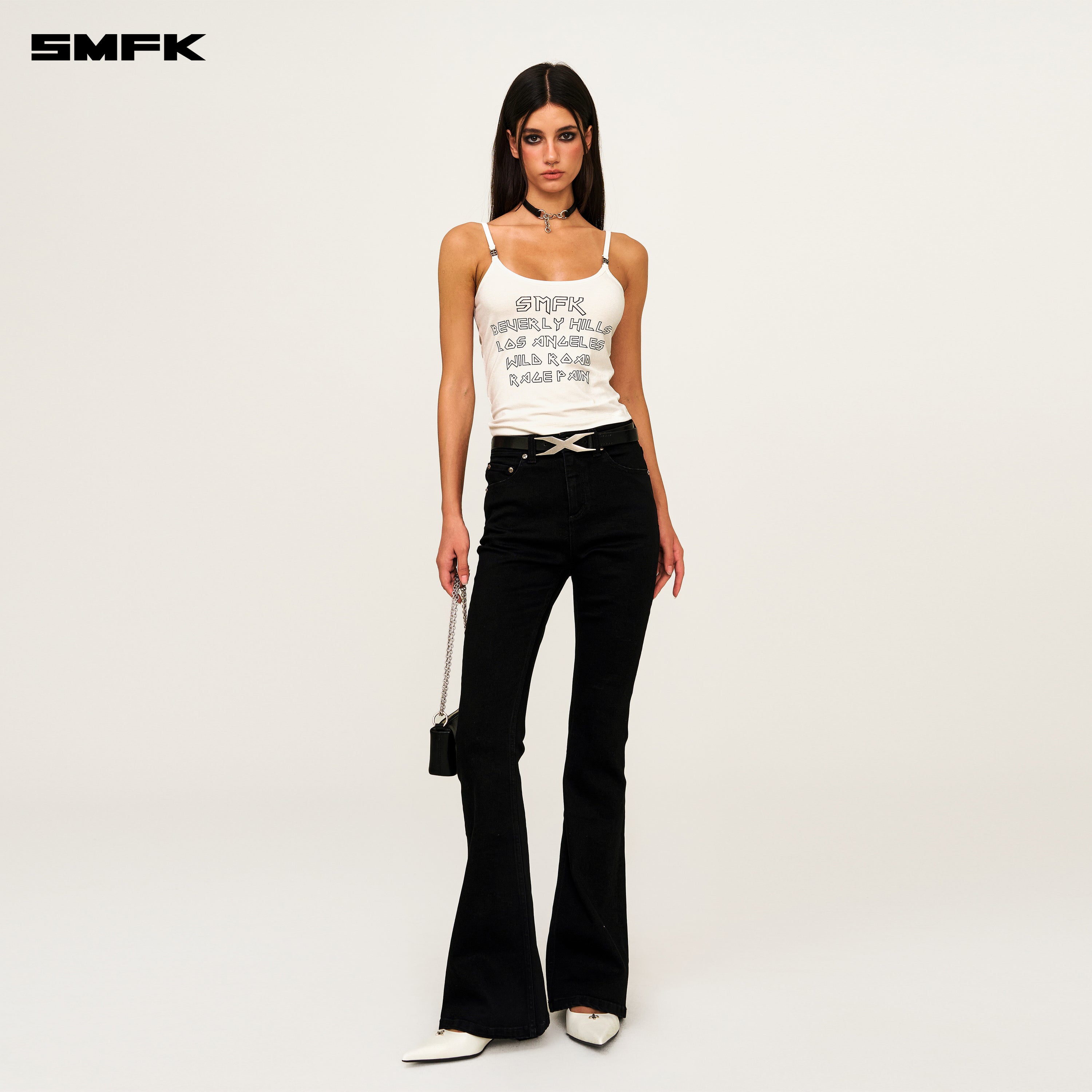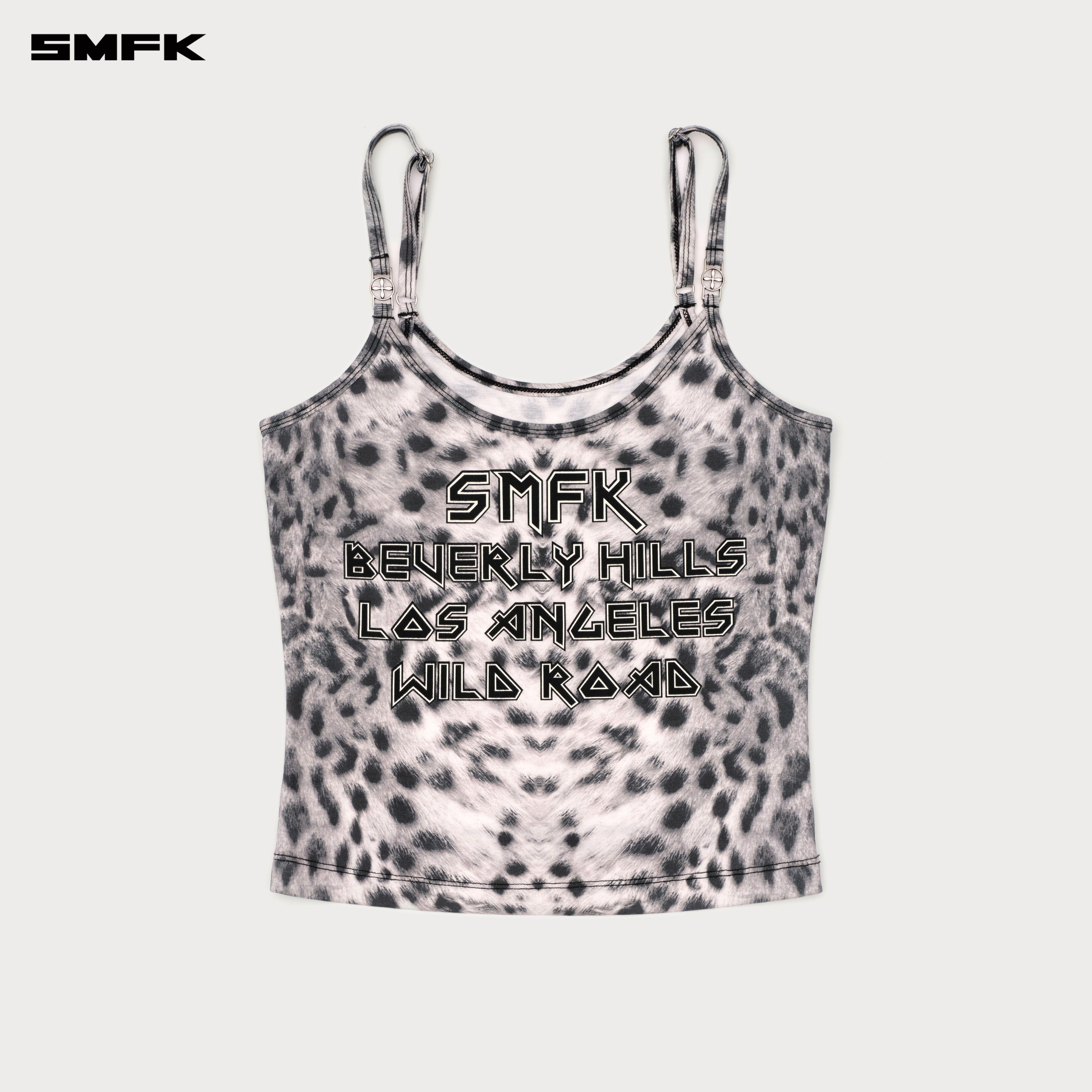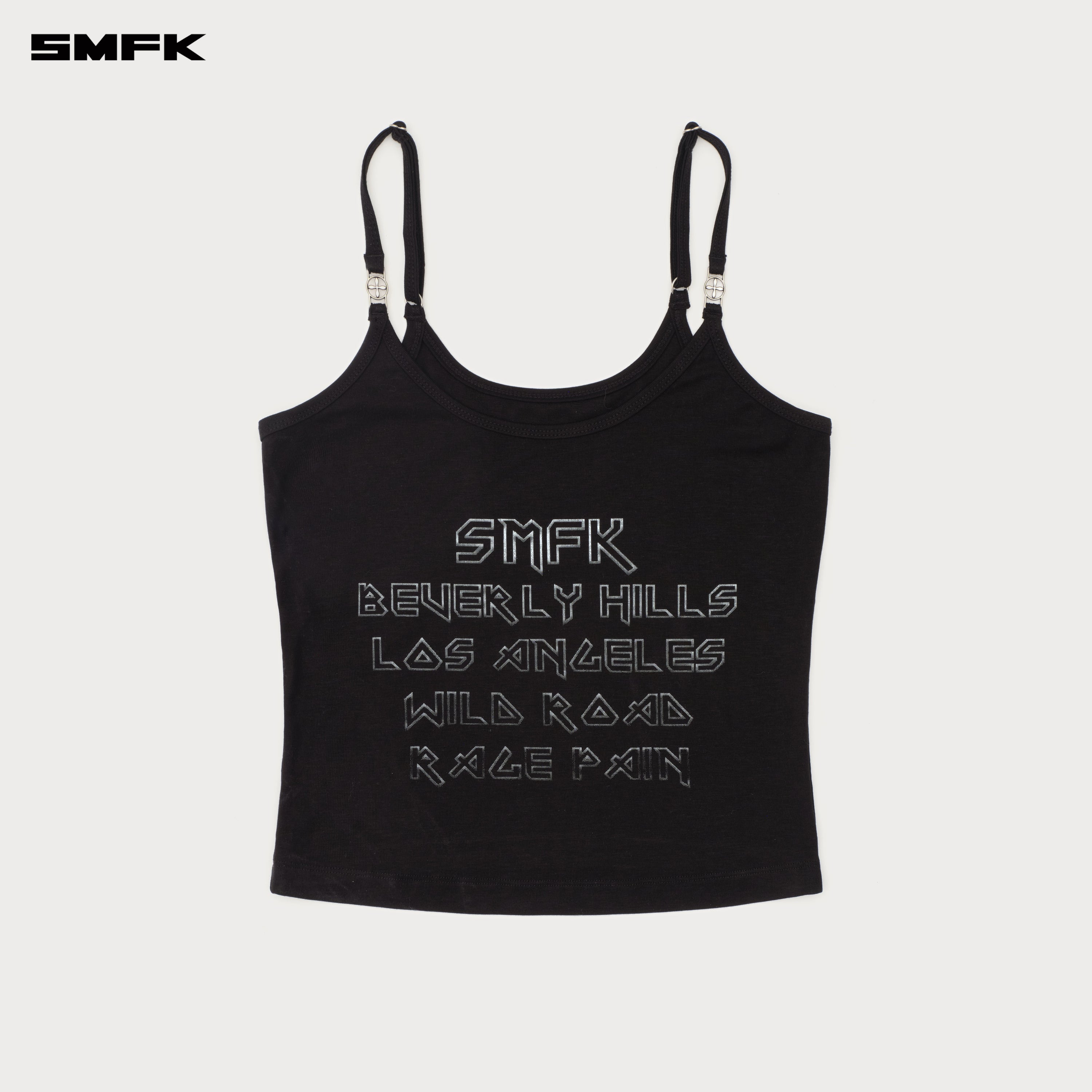 - Design: A sports strap top designed by SMFK in 2023, fitted-waist. Metal circular compass buckle on shoulder strap, adjustable back shoulder strap. "SMFK Beverly Hills boutique" in metal rock fonts printed on the front and back.