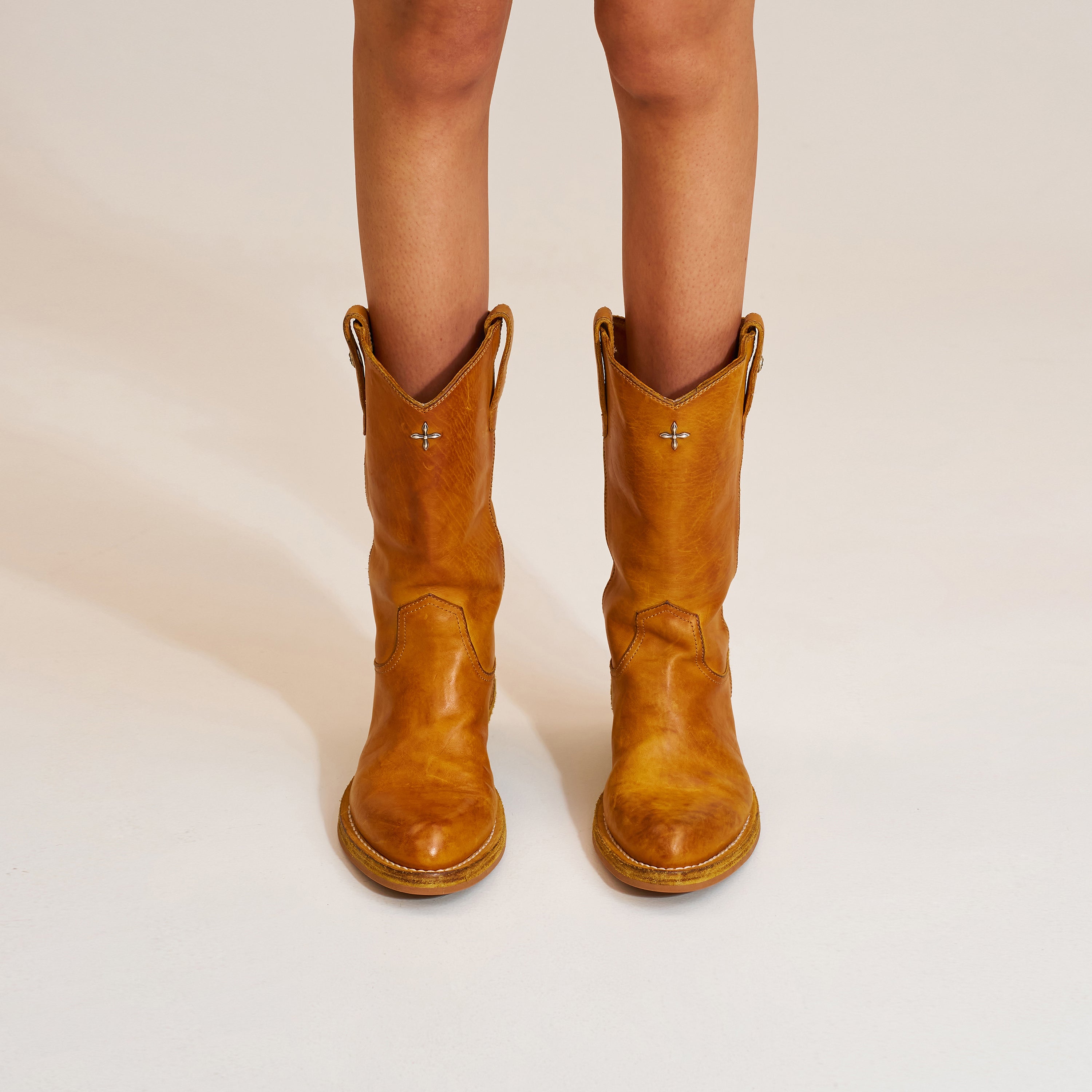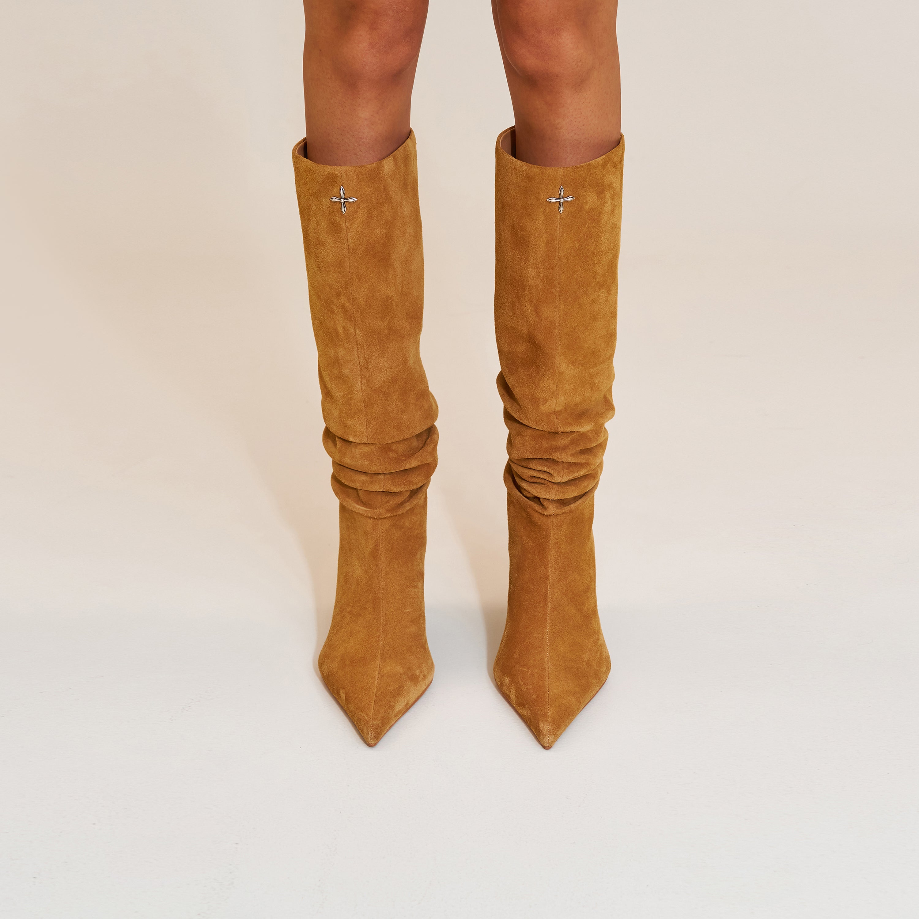 ジンジャー色の十字架像のレザーとファーのスリッパ